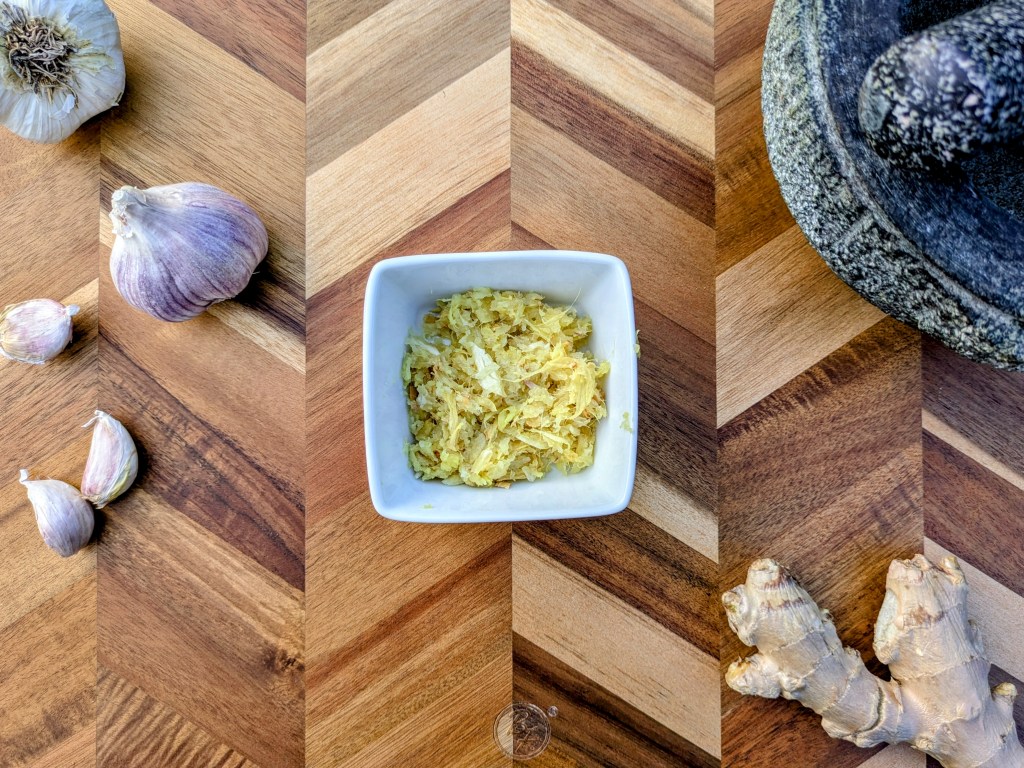 La pâte d’ail et de gingembre est une base incontournable dans la cuisine du sous-continent indien. Préparée au mortier, elle développe des arômes plus intenses et une texture plus authentique qu’au mixeur. Elle apporte profondeur et richesse aux currys, marinades et plats sautés.